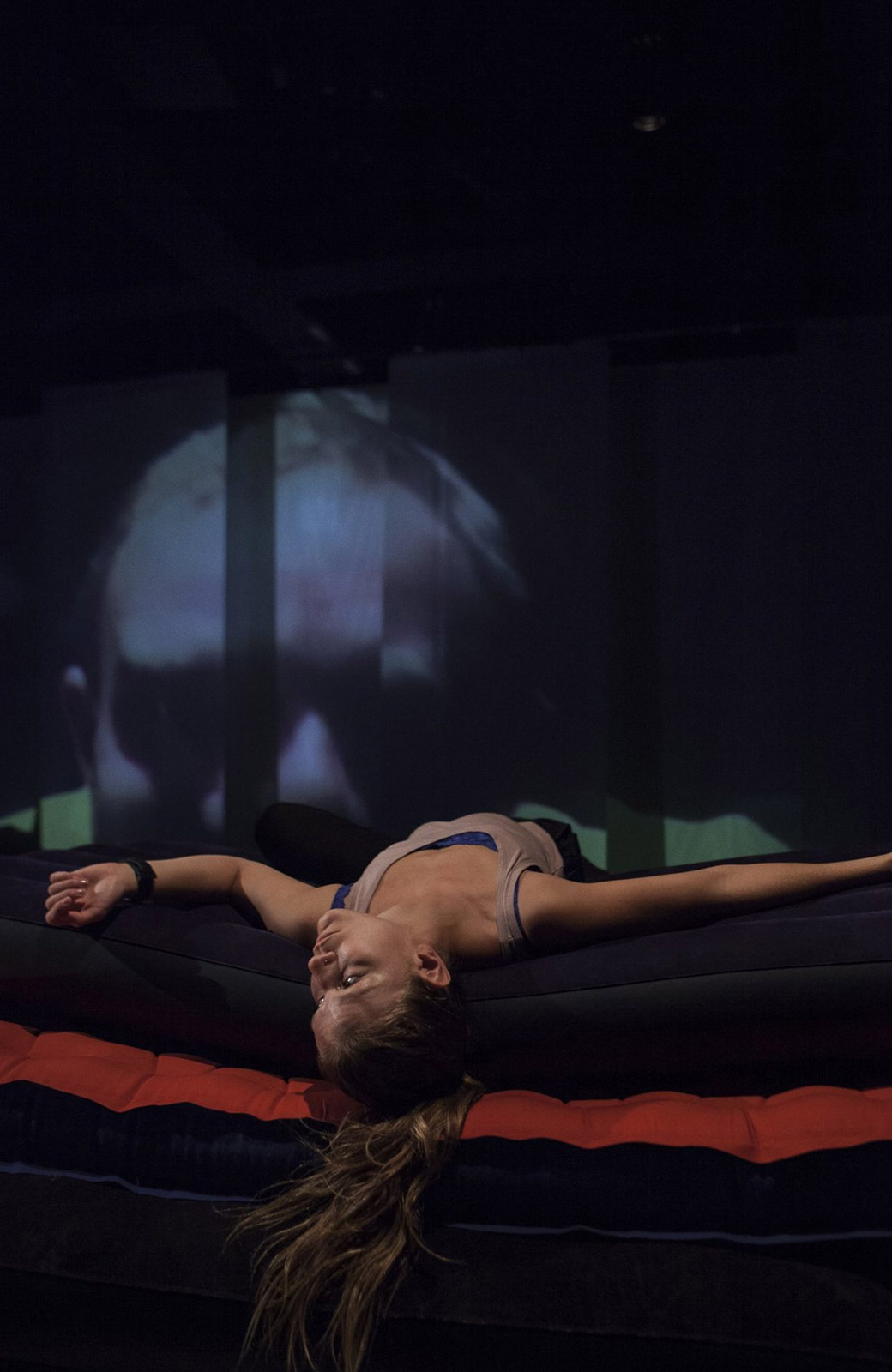 Patrick Saint-Denis, le génial inventeur de la machine à vent interactive de la pièce Trois paysages, signe ici la conception sonore et technologique. Pour Danse de nuit, il a développé un système qui permet à la chorégraphe de faire danser les mots tout en générant une musique sensible en direct à partir de battements de cœurs des interprètes. À travers ce spectacle s’inscrit le désir de dévoiler ce qui se cache dans la noirceur et de rendre hommage à la fragilité.