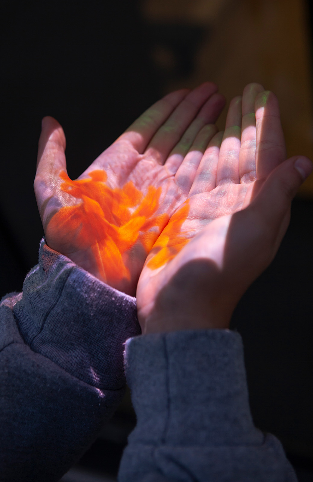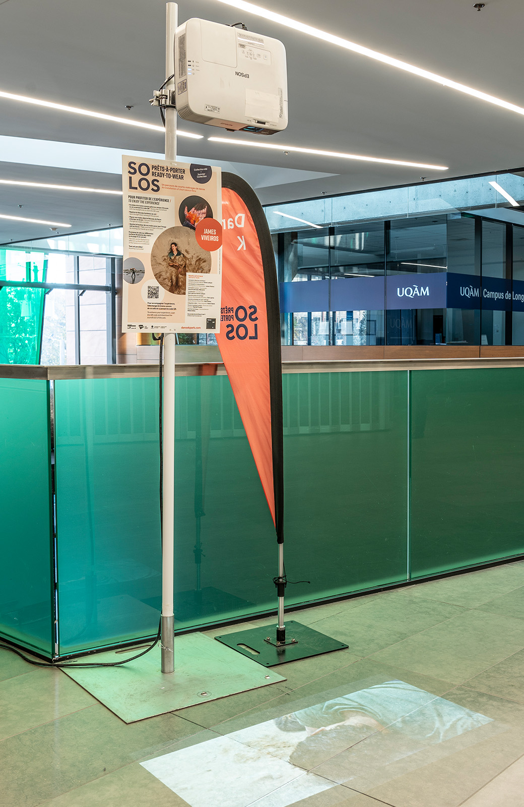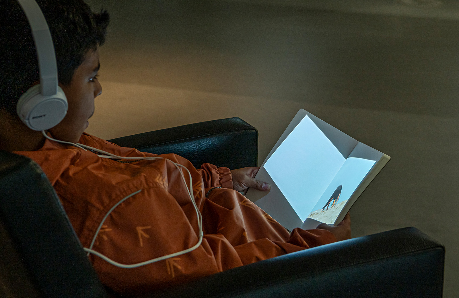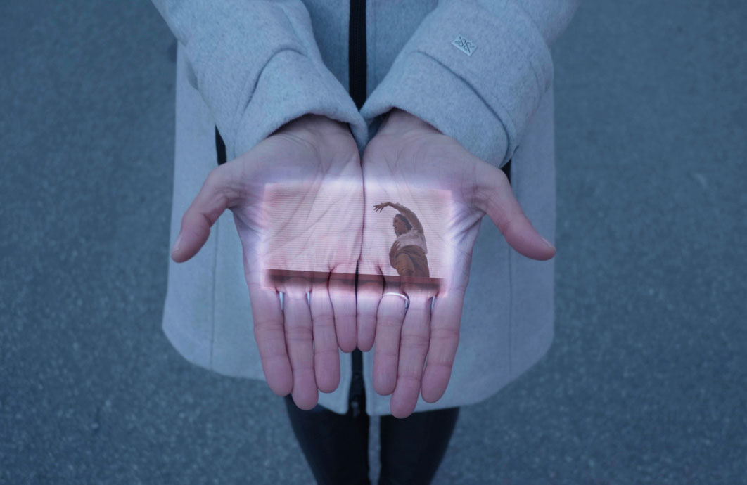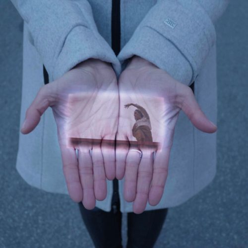Les Solos prêts-à-porter, c’est aussi une installation vidéo, où on invite le public à recevoir la projection des courts métrages de manière tout à fait intime : en se servant de la paume de ses mains, d’un livre, ou du sol comme un écran. Pour accompagner l’expérience, chaque film est accompagné d’une trame sonore transmise par un casque d’écoute.